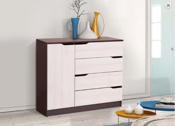 Четыре вместительные выдвижные ящика комода расположены справа, слева - за распашной дверкой отделение с полкой. Универсальной сборки нет.