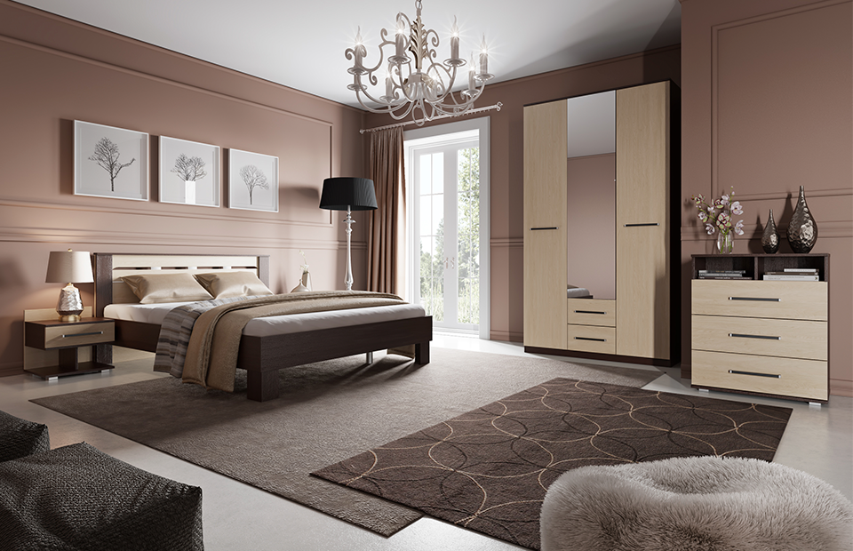 Эффектный спальный гарнитур «Женева» выгодно отличается цветовым контрастом, в основе которого темные корпуса и светлые фасады. Производители при создании этой спальни учли все самое необходимое, здесь нет ничего лишнего. Вместительный, но компактный шкаф для одежды с зеркалом прекрасно станет в любую часть комнаты и не будет при этом казаться громоздким. То же и с комодом: не занимая много места, он прекрасно вместит в себя достаточное большое количество вещей. Кровать на ножках с изголовьем современного дизайна с очень удобной прикроватной тумбой приятно удивит своим удобством и комфортом.