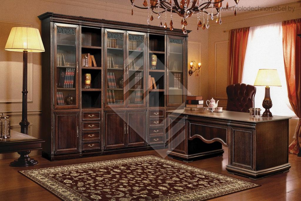 Изогнутые линии, искусные кружева, налёт старины на шкафах предназначенных для хранения книг, сувениров, альбомов и других дорогих для сердца вещей. Прекрасным дополнением идёт к шкафам письменный стол с широкой рабочей поверхностью, маня к себе многочисленными ящиками .