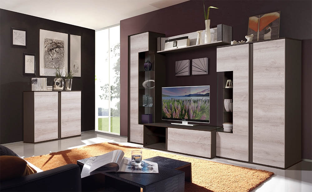 Гостиная «Вайоминг» – модульный компактный комплект для холла, сочетающий глубокие темные и природные светлые ноты. Дизайн мебели – легкость с оттенком модерн-идей. Фасады «Вайоминг» изготавливаются из ЛДСП «Дуб Сакраменто» с древесным рисунком, корпуса – из насыщенных по цвету темно-коричневых плит. Гармоничная гамма легко станет центральным звеном замысловатых интерьеров.