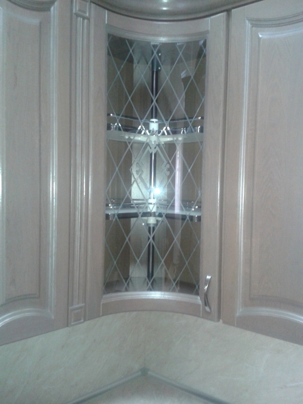 Фурнитура: ручки и петли с доводчиком фирмы «Boyard», направляющие с доводчиком, выдвижные и поворотные полки — фирмы «Hettich». Витражи изготовлены по технологии «кристаллайн».