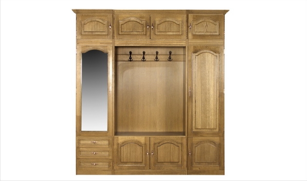 Прихожая выполнена из дуб, в ореховом цвете. Является очень вместительным мебельным гарнитуром, оснащенным множеством модулей для хранения. Фасады украшены симметричной резьбой в классическом стиле. Данная модель оборудована высоким прямоугольным зеркалом, открытые вешалки для одежды представлены чернеными тройными крючками на деревянной планке, фурнитура сложной формы, выполнена в золотом цвете. В мебельном гарнитуре кроме классических шкафчиков для хранения также имеются выдвижные ящики. Прихожая имеет линейную симметричную конструкцию