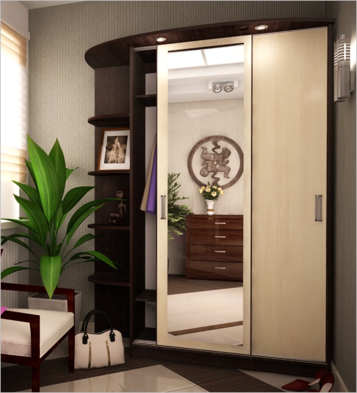 2-х дверный шкаф-купе для прихожей уменьшенной глубины с двумя отделениями и угловой консолью, оборудован встроенной подсветкой на 2 светильника. Исполняется с левой и правой консолью.