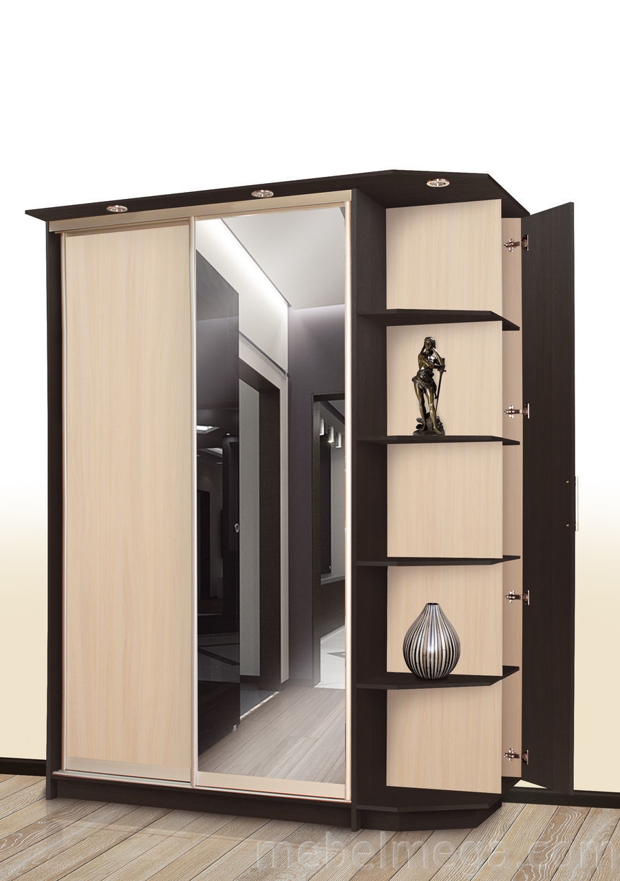 Стильный шкаф-купе №9 с открытыми боковыми полками – это как раз то, что необходимо людям, которые выбирают шкаф-купе не только для хранения вещей, но и для украшения интерьера. Модель выполнена из ЛДСП темного и светлого оттенков, имеет две двери. Правая дверь шкафа является зеркальной. Данный шкаф отлично будет смотреться не только в спальной, но и в прихожей.