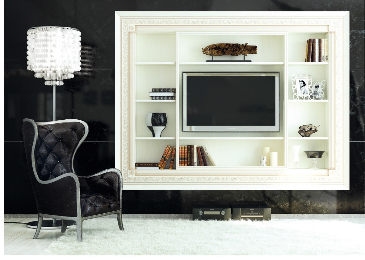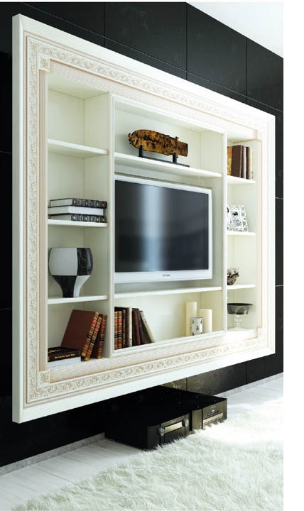 Навесной шкаф, выполненный в оригинальной манере, сочетает в себе функции шкафа и панели для телевизора. Рама выполнена из комбинированного багета Б-3, плинтуса мебельного ПМ-3 и декоративной накладки «Виола» шириной 80мм.