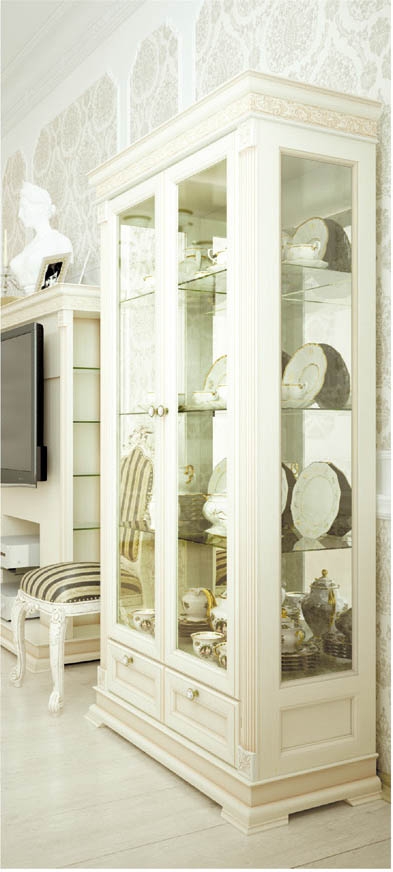 Двухдверный вариант шкафа имеет зеркальную заднюю часть и два выдвижных ящика снизу Несмотря на то, что шкаф более метра шириной, он не теряет своей легкости и прозрачности в интерьере. Корпус отделан декоративными накладками «Виола» 80мм. Данная модель может быть выполнена без витрин с торцов корпуса. В таком варианте шкаф имеет название Шкаф глухой ШГ-2.