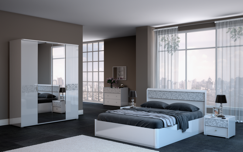 Вам необходима белая мебель для спальни, которая бы сочетала в себе красоту и комфорт? Тогда спальня «Адель» - то, что вам нужно. Уникальная интерпретация орнамента, напоминающего узоры на окне в зимний морозный день, выполнена матовым серебром на белоснежном глянце. Корпус коллекции изготовлен из ЛДСП толщиной 18 мм, фасады из белой лакированной ЛДСП толщиной 18 мм с серебряной шелкографией. Красоту коллекции подчеркивают металлические ручки, украшенные кристаллами «Swarovski», и диодная подсветка, встроенная в карниз шкафа.