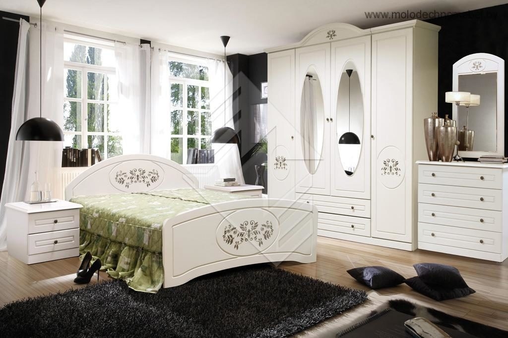 Спальня отличается лёгкостью и грациозностью, достигнутой благодаря белому цвету, незатейливому рисунку, овальным зеркалам и плавным линиям на изделиях.