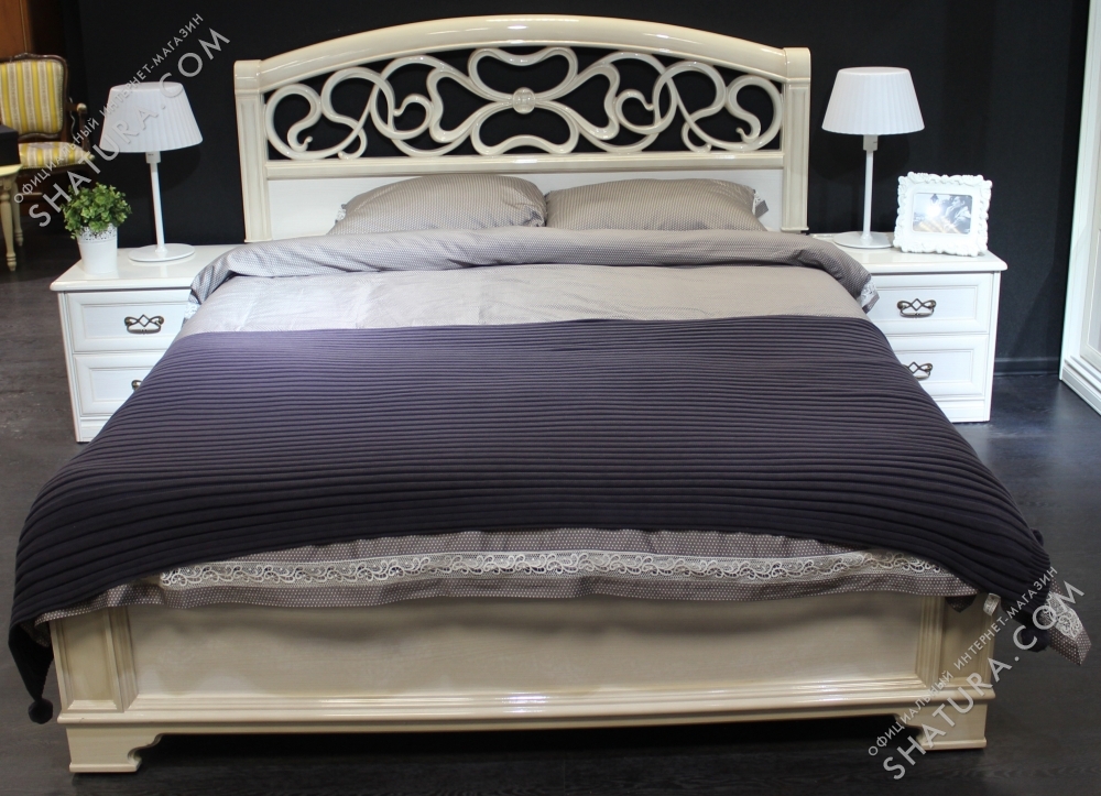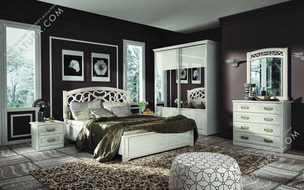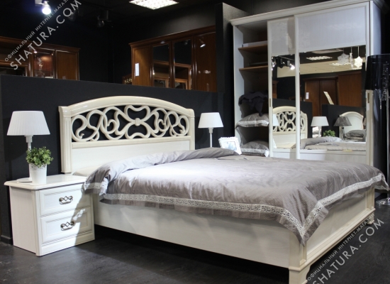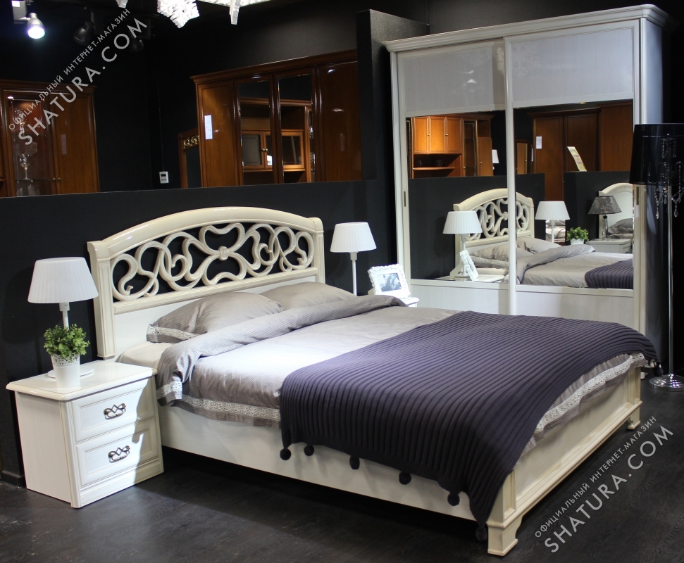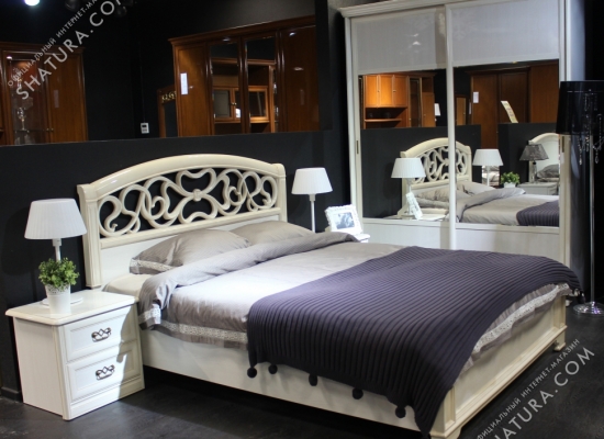 Дополнительные свойства: Модульная система с широким выбором элементов. Глянцевая спальня с ажурным изголовьем кровати, фигурными бронзовыми ручками и покрытыми лаком декоративными профилями. Двери шкафа-купе оснащены эргономичными врезными ручками. Кровать может быть как с подъемным механизмом, так и с выдвижными ящиками
