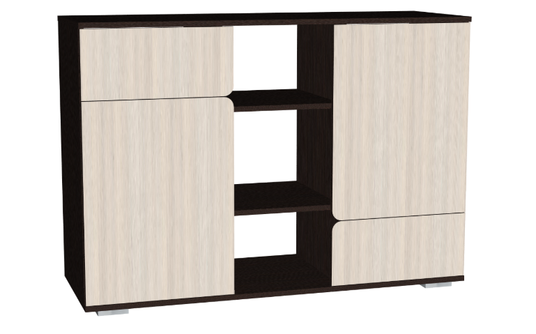 Вместительная удобная тумба с четырьмя закрытыми отделениями практично решит проблему хранения. Тумба оборудована двумя отделениями с полкой за распашными дверками и двумя выдвижными ящиками. Оригинальная конструкция тумбы предусматривает открытые ниши для декора и различных мелочей.