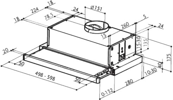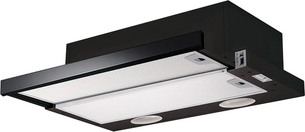 традиционный, с открытой панелью конструкция, монтаж для встраивания в шкафчик, ширина монтажа 60 см, режим: отвод, циркуляция, жироулавливающий фильтр, производительность 450 куб.м/ч, количество двигателей: 1, механическое управление, галогенная лампа, сталь, стекло, черный