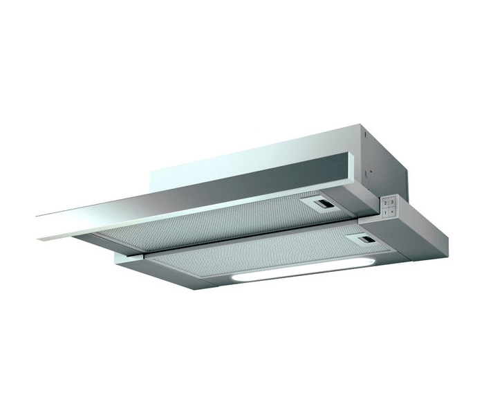 традиционный, с открытой панелью конструкция, монтаж для встраивания в шкафчик, ширина монтажа 60 см, режим: отвод, циркуляция, жироулавливающий, угольный фильтр, производительность 650 куб.м/ч, количество двигателей: 1, механическое управление, галогенная лампа, сталь, серый