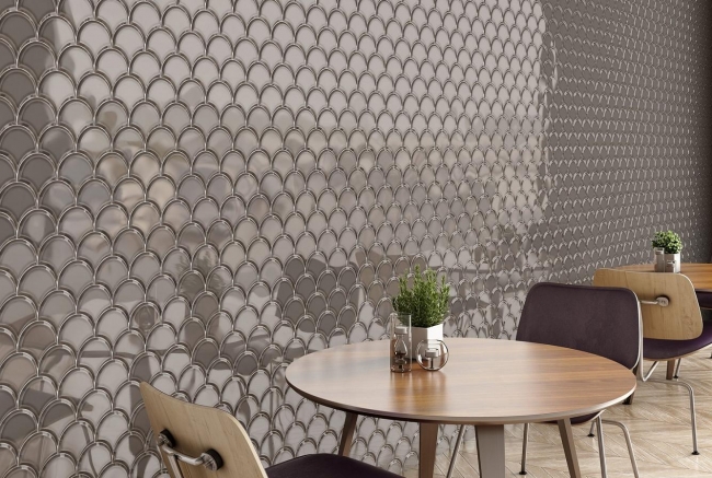 Так же в моду вошла плитка, имитирующая природные формы – от растений до рыбных чешуек – в спокойных мятных оттенках или пятнистого серого цвета. Заслуживает внимание и мозаичная плитка в розовых, фиолетовых и салатовых оттенках.